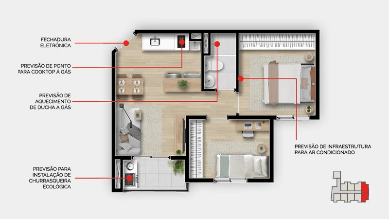 Planta Tipo C: 37,06 m² - 2 dormitórios