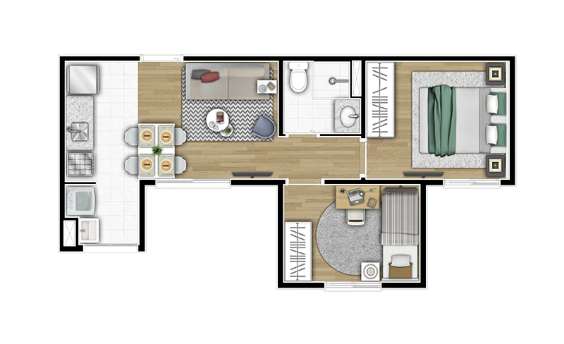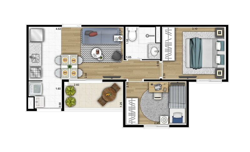 2 dormitórios 45,18 m² - 45,99 m² - 46,25 m²